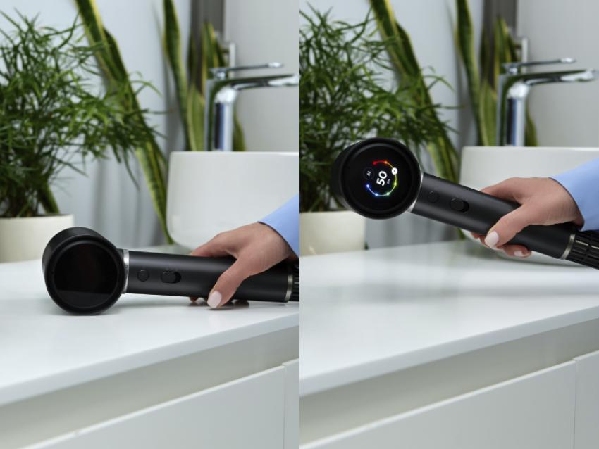 Fén s umělou inteligencí neustále monitoruje vzdálenost od vašich vlasů a automaticky přizpůsobuje teplotu tak, aby odpovídala nastavené cílové hodnotě. Tento chytrý systém zajišťuje, že se teplota vzduchu přizpůsobuje aktuálním podmínkám - díky tomu zabraňuje přehřátí a chrání vlasy před poškozením. Výsledkem je účinné a šetrné vysoušení, které zachovává přirozenou strukturu a vitalitu vlasů, zatímco nabízí ideální podmínky pro dokonalý styling.