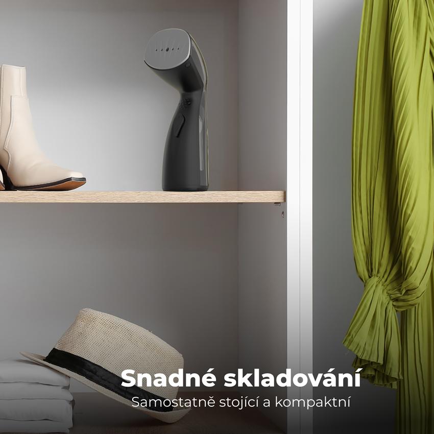 Nízká hmotnost napařovače v kombinaci s vysokým výstupem páry umožňuje napařování přímo na ramínku, aniž byste museli využívat objemné žehlicí prkno.