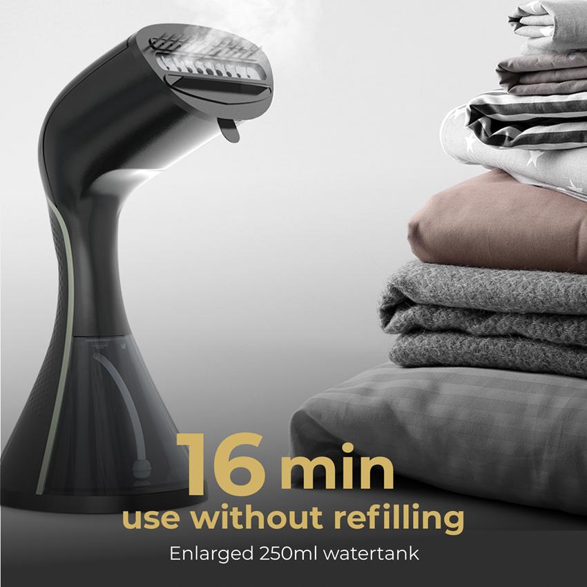 Díky zvětšené nádržce na vodu o objemu 250 ml vydrží napařovat více oděvů až 16 minut bez přerušení.
