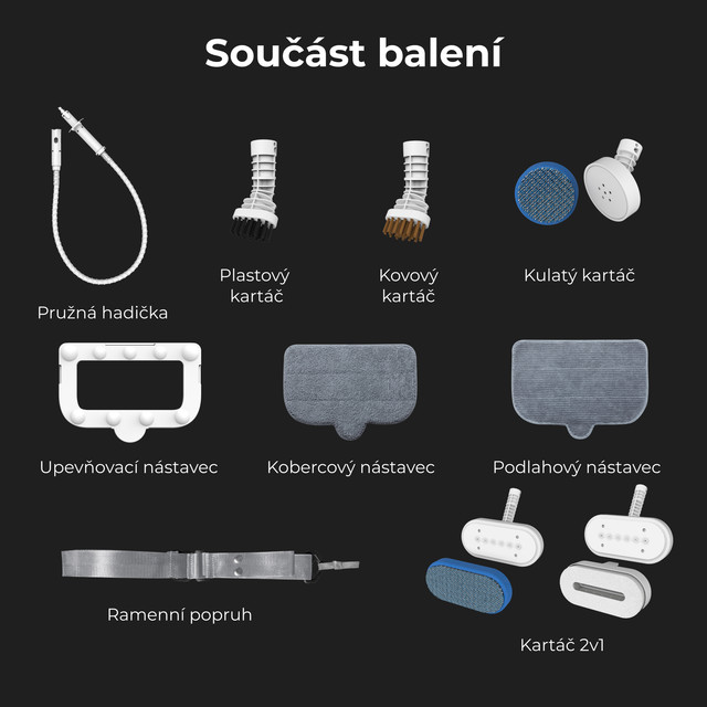 Příslušenství v balení: Ohebná hadice, plastový kartáč, kovový kartáč, kulatý kartáč, nástavec na koberce, mop na koberce, mop na podlahu, kartáč 2v1, ramenní popruh