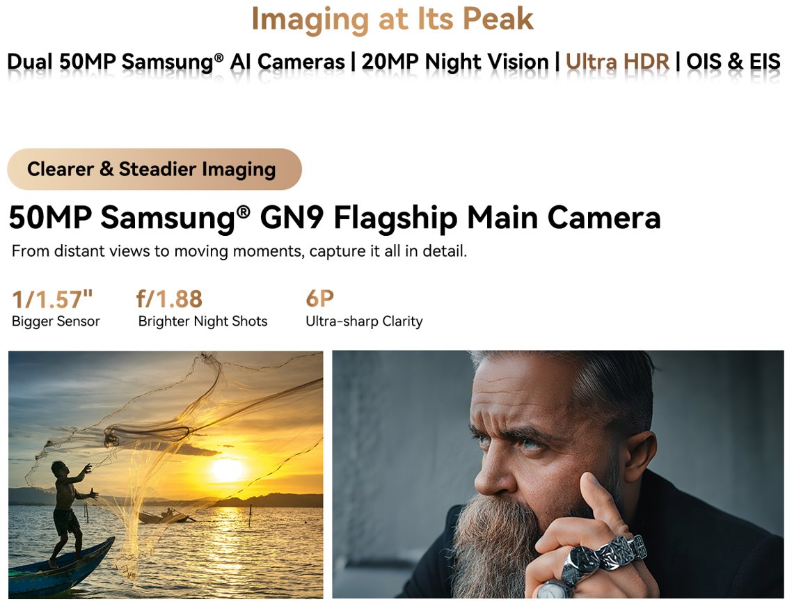 - Fotografie ve dne i v noci: 50MP hlavní snímač Samsung s optickou stabilizací (OIS) doplňuje 20MP kamera s infračerveným nočním viděním pro záběry v naprosté tmě.