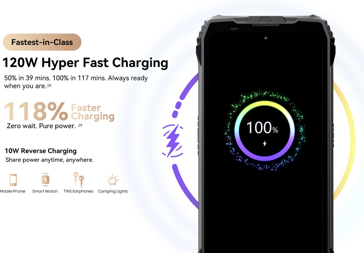 - Extrémní výdrž a rychlost: Baterie s kapacitou 20 000 mAh udrží telefon v provozu celé týdny v pohotovostním režimu. Díky 120W superrychlému nabíjení ji však dobijete na 50 % za neuvěřitelných 39 minut.