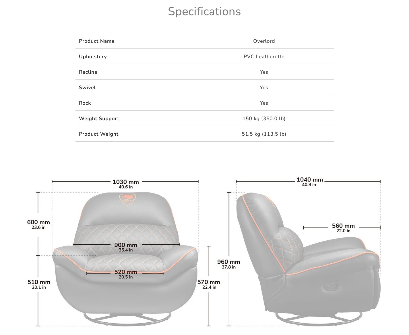 Overlord měří 103 cm na šířku a 56 cm do hloubky: to je dostatečná plocha pro hraní her, sledování seriálů či filmů nebo jen pro relaxaci. Když na něj položíte přehoz a polštáře, je to odpočinková základna jako stvořená pro krále.