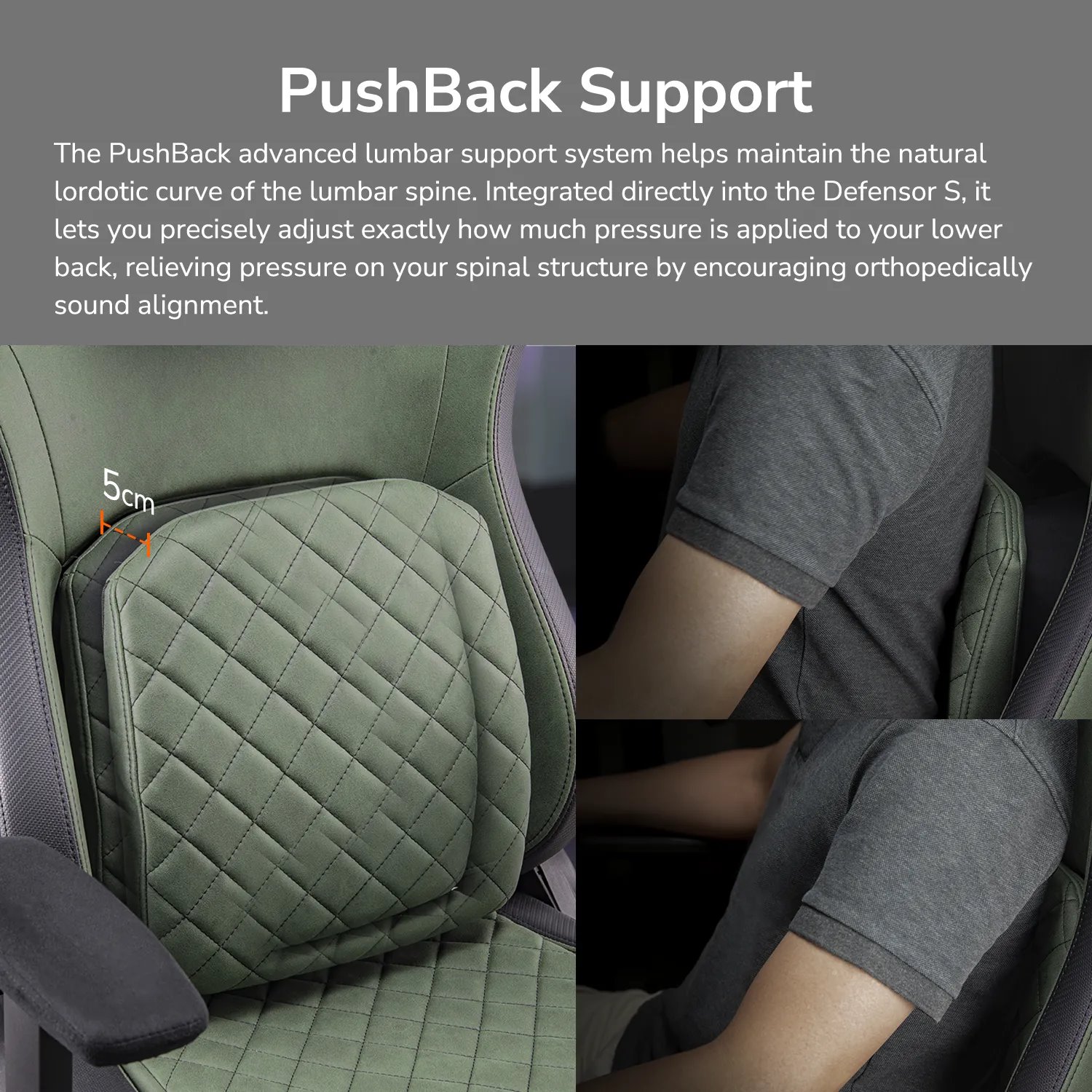 Židle je vybavena pokročilým systémem bederní opory PushBack, který umožňuje nastavení tlaku na spodní část zad a podporuje přirozené zakřivení páteře.