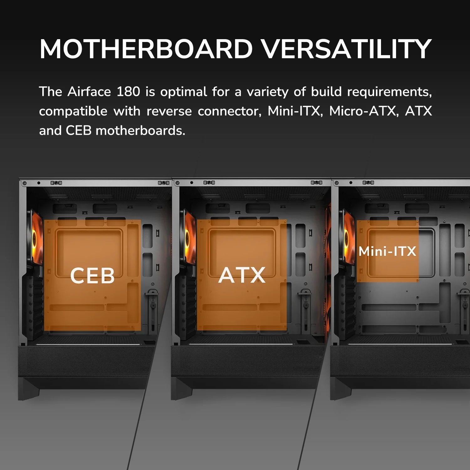 Airface 180 je vhodná pro hráče, kteří chtějí spolehlivý chassis s vynikajícím chlazením, stejně jako pro uživatele stavějící výkonné pracovní PC či kreativní stanice. Skříň poskytuje flexibilitu pro různé typy buildů – od tichých konfigurací po agresivně chlazené herní sestavy.