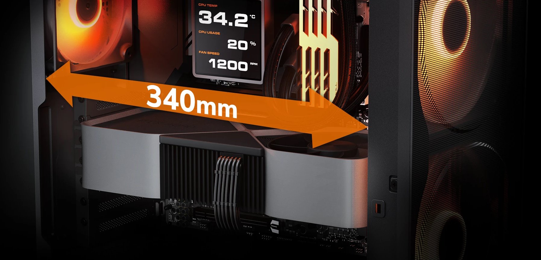 Prostorný interiér pro výkonné komponenty a dlouhé grafické karty