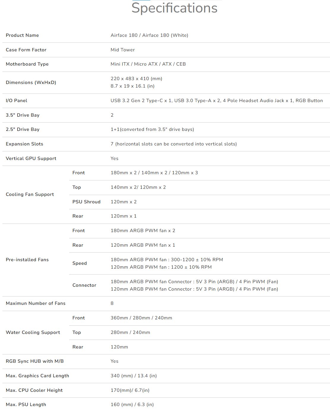 Cougar Airface 180 je elegantní a vzdušná počítačová skříň navržená pro hráče i náročné uživatele, kteří chtějí výborné chlazení, moderní design a prostor pro výkonné komponenty. Díky optimalizované konstrukci a dobře promyšlenému proudění vzduchu poskytuje ideální prostředí pro stabilní chod celé sestavy.