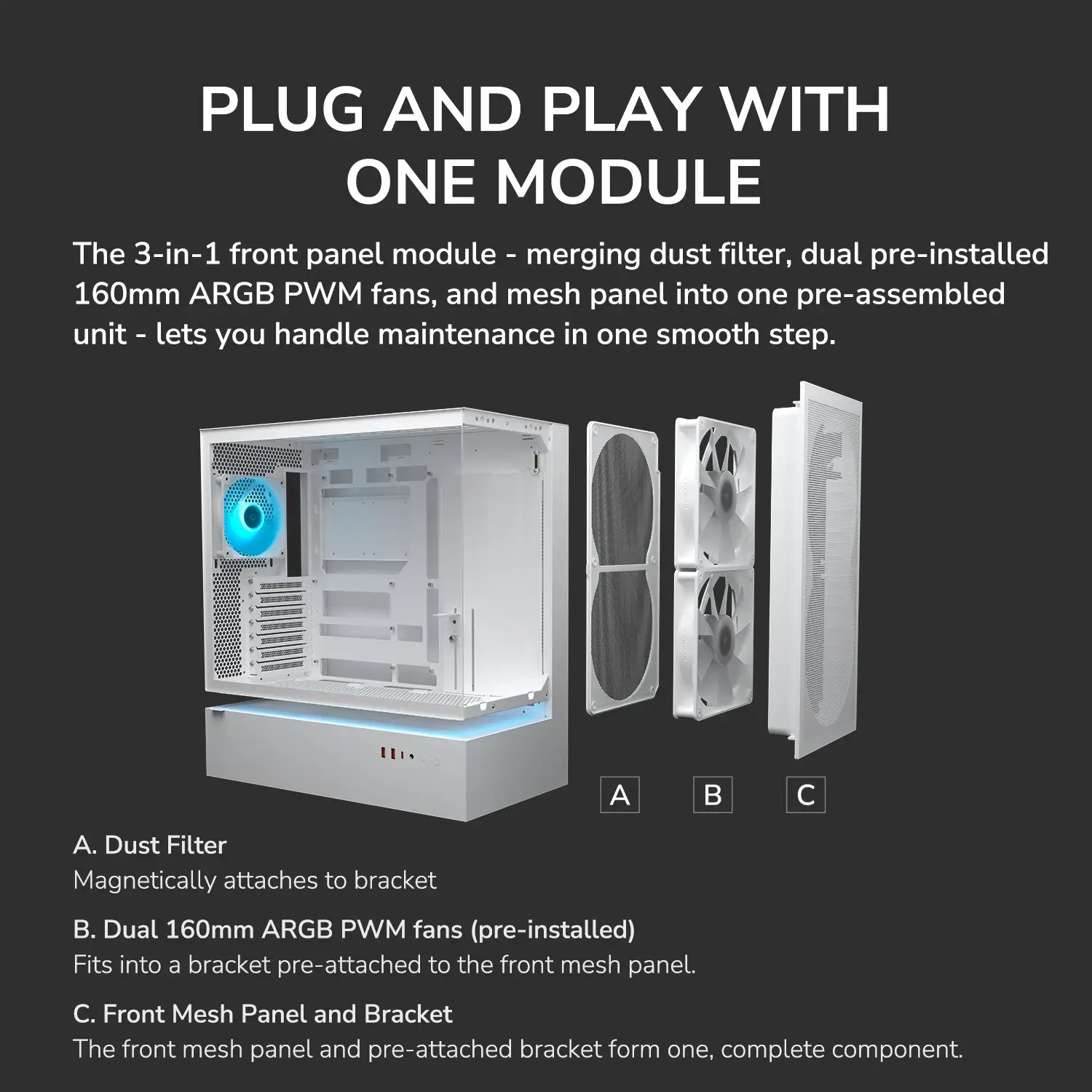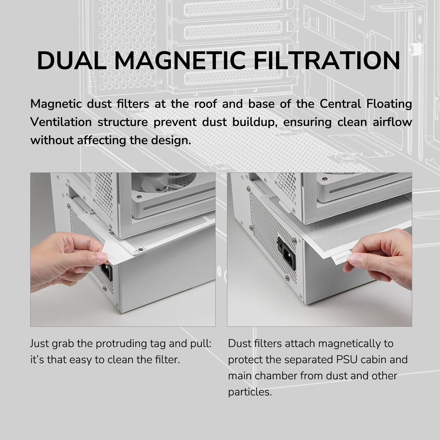 Magnetické prachové filtry na střeše a základně centrální plovoucí ventilační struktury proaktivně zabraňují hromadění prachu a nečistot, udržují čistý a nepřerušovaný proud vzduchu, aniž by narušovaly zavěšený design.