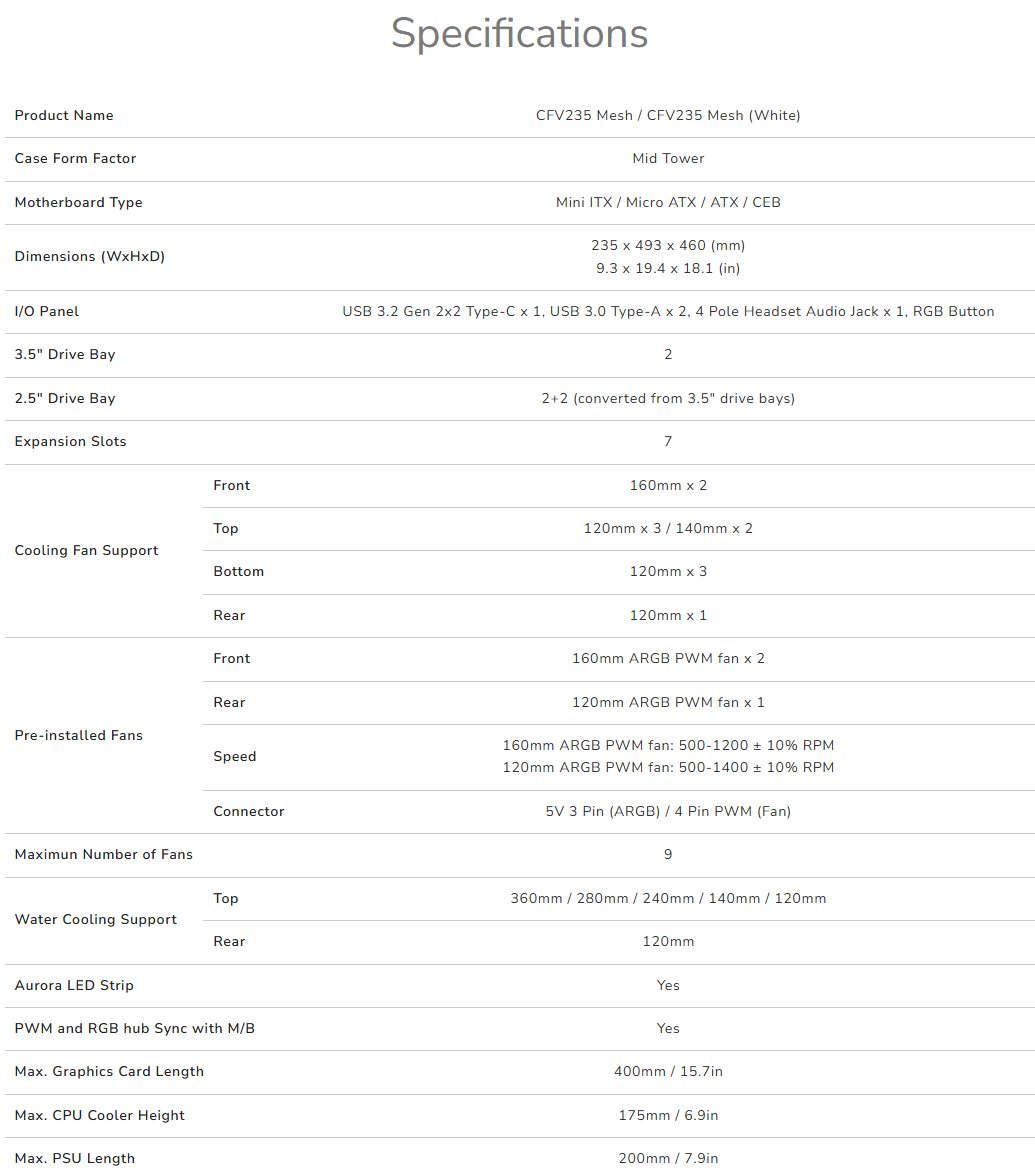 CFV235 má ventilátorovou kapacitu 3x120 mm nebo 3x140 mm na horní straně, 3x120 mm na dně hlavní komory, 2x120 mm ventilátory na straně základní desky a 1x120 mm (předinstalovaný) na zadní straně. Podpora vodního chlazení dosahuje maxima 360 mm na horní straně.