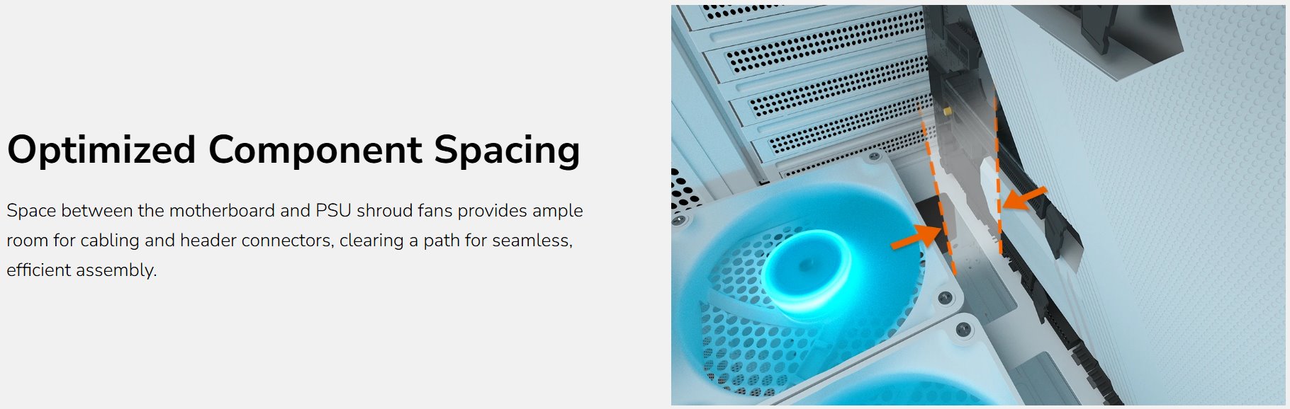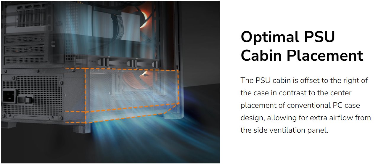 Unikátním prvkem je perforovaný kryt zdroje (PSU shroud), na který lze osadit až 3 další 120mm ventilátory.