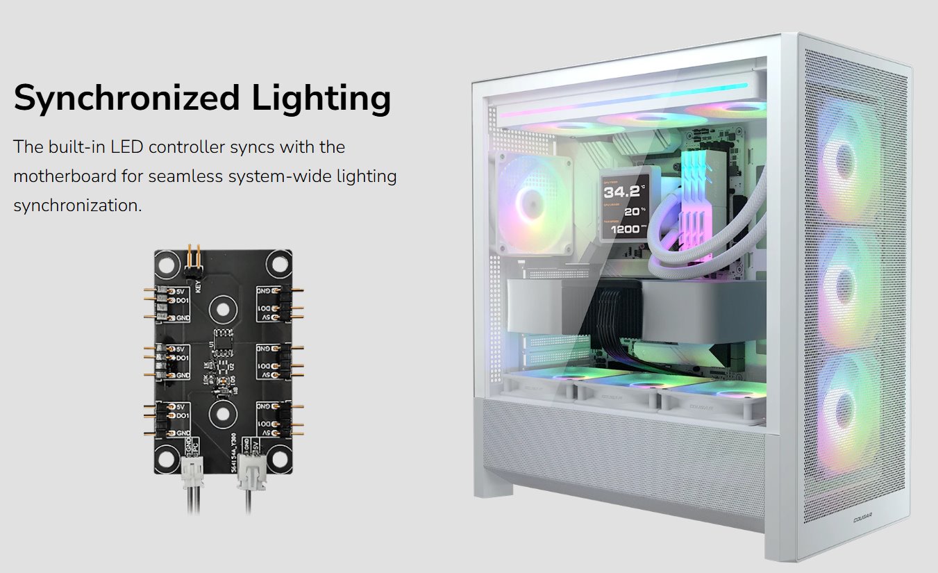 Osvětlení lze snadno ovládat pomocí vyhrazeného tlačítka na horním panelu nebo synchronizovat se základní deskou prostřednictvím 5V ARGB konektoru.