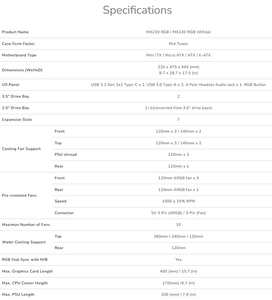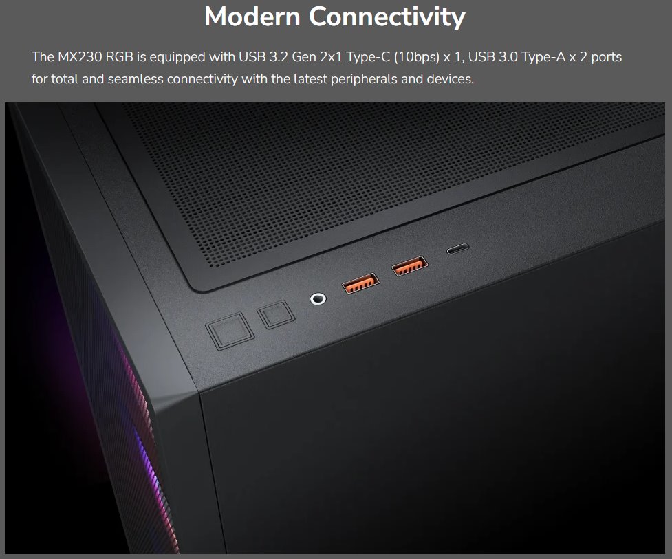 Cougar MX230 RGB je počítačová skříň typu Mid-Tower, která se zaměřuje na extrémní efektivitu chlazení a moderní design.