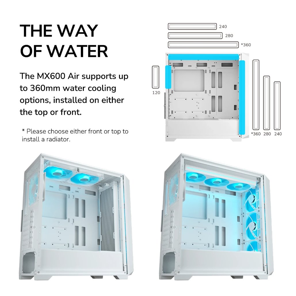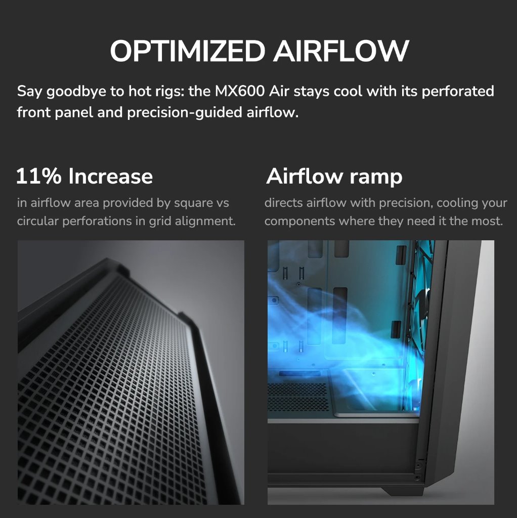 Konstrukce skříně je založena na čtvercově perforovaném předním panelu, který maximalizuje nasávání vzduchu. Integrovaná vnitřní rampa směruje proudění vzduchu přes klíčové části systému a zvyšuje celkovou efektivitu chlazení. MX600 Air podporuje instalaci až sedmi ventilátorů, což umožňuje flexibilní nastavení proudění vzduchu podle potřeb sestavy. Skříň rovněž podporuje vodní chlazení s radiátory až do velikosti 360 mm, které lze instalovat do přední nebo horní části.