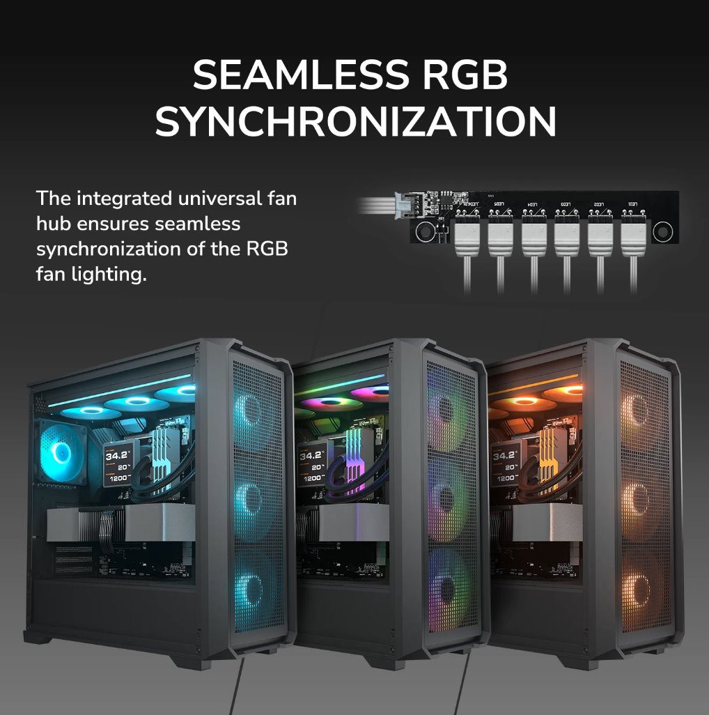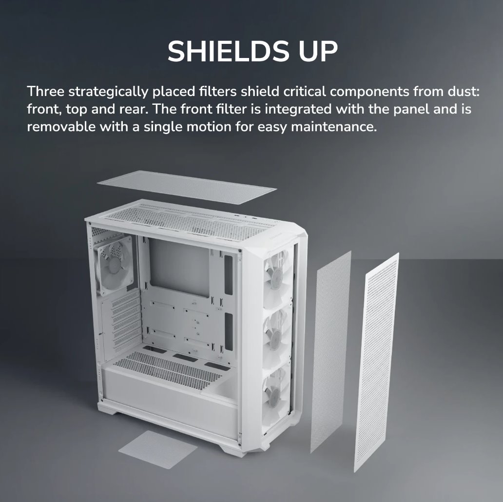 Z výroby je skříň osazena třemi 140mm ARGB ventilátory v přední části a jedním 120mm ARGB ventilátorem vzadu, což zajišťuje silný přísun chladného vzduchu a efektivní odvod tepla. Součástí jsou také tři odnímatelné prachové filtry umístěné v přední, horní a zadní části skříně, které chrání komponenty před nečistotami a usnadňují údržbu.