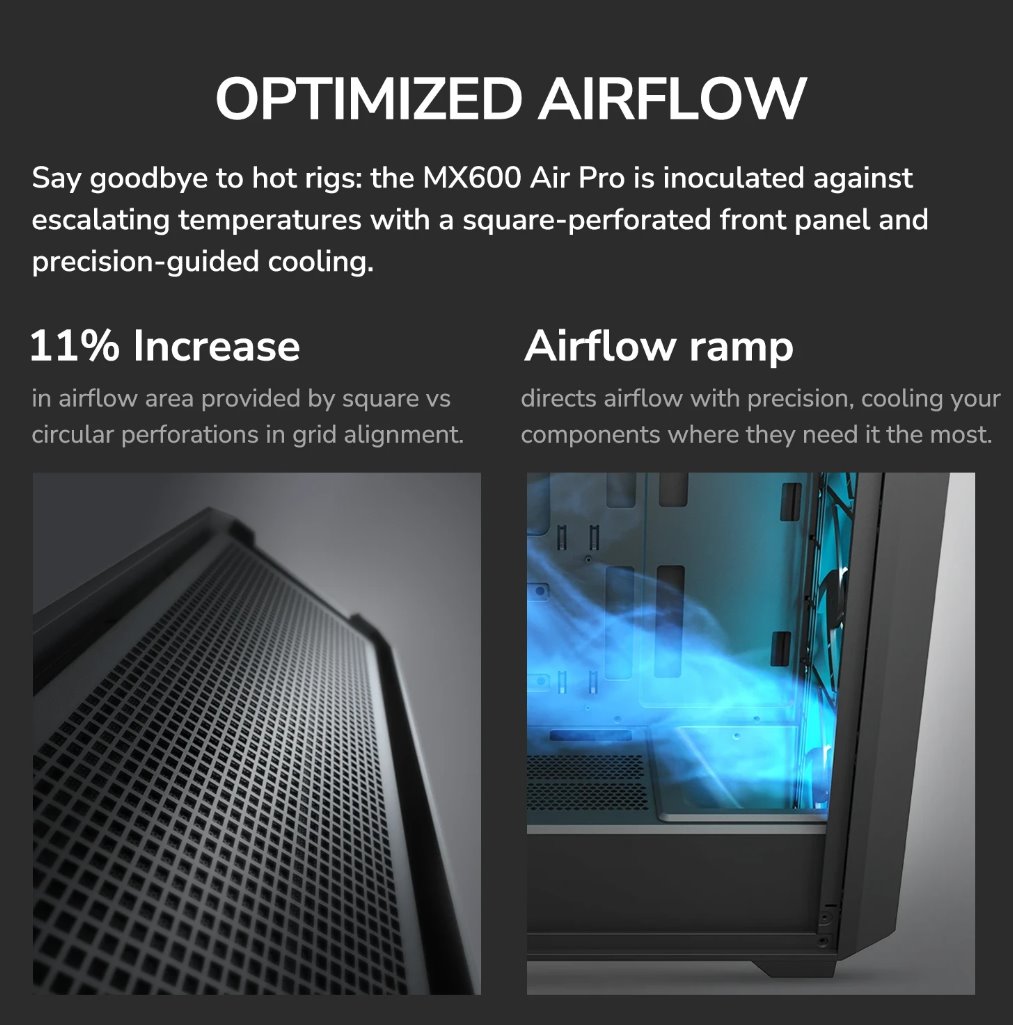 COUGAR MX600 Air Pro je moderní mid-tower PC skříň navržená pro efektivní proudění vzduchu a maximální kompatibilitu s výkonnými komponenty. Díky promyšlené konstrukci, vysoké kapacitě chlazení a robustnímu provedení je vhodná pro herní i pracovní sestavy s vysokými nároky na stabilitu a výkon.