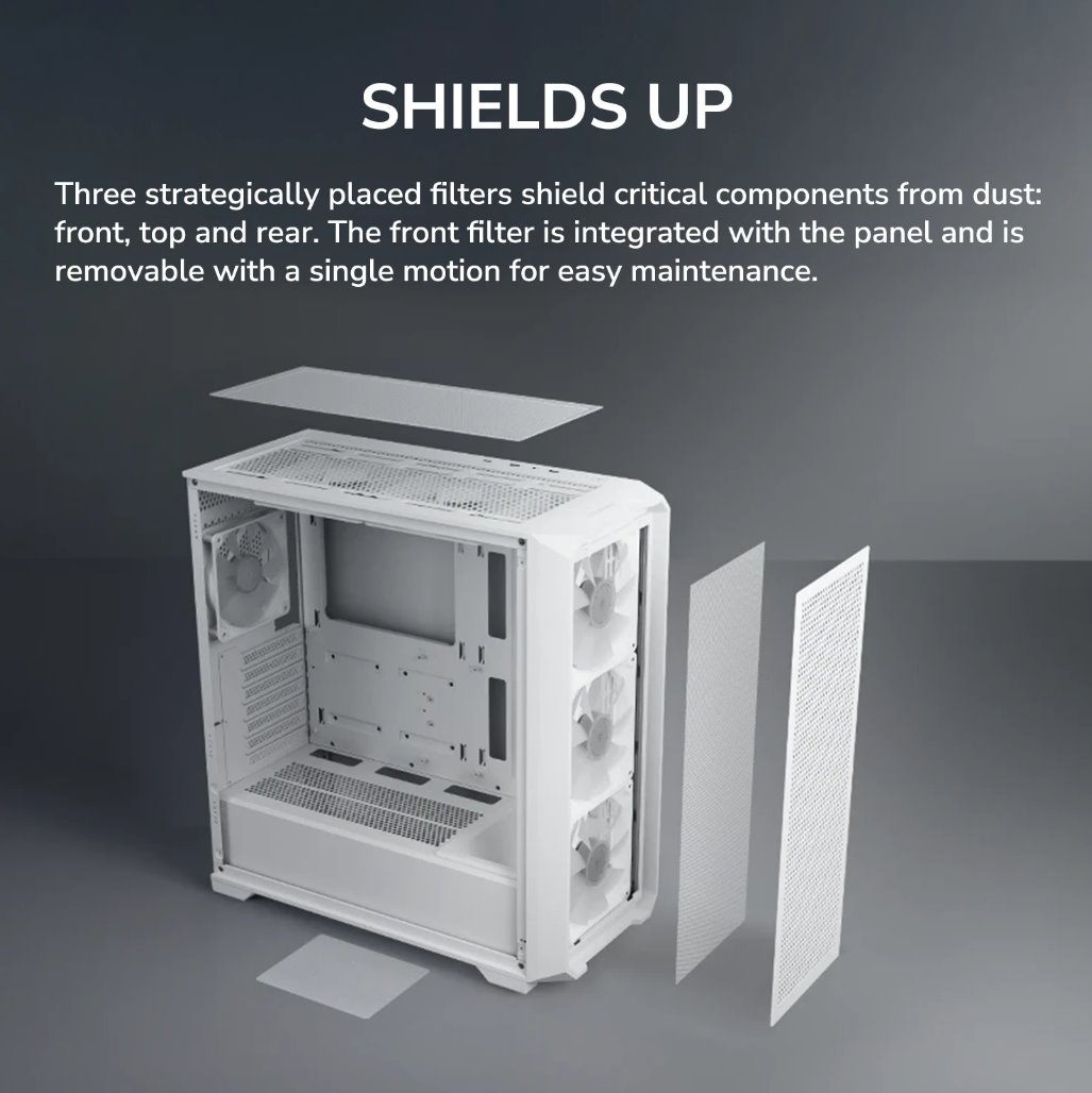COUGAR MX600 Air Pro je vybavena odnímatelnými prachovými filtry v přední, horní a zadní části skříně, které chrání vnitřní komponenty před nečistotami a usnadňují pravidelné čištění.