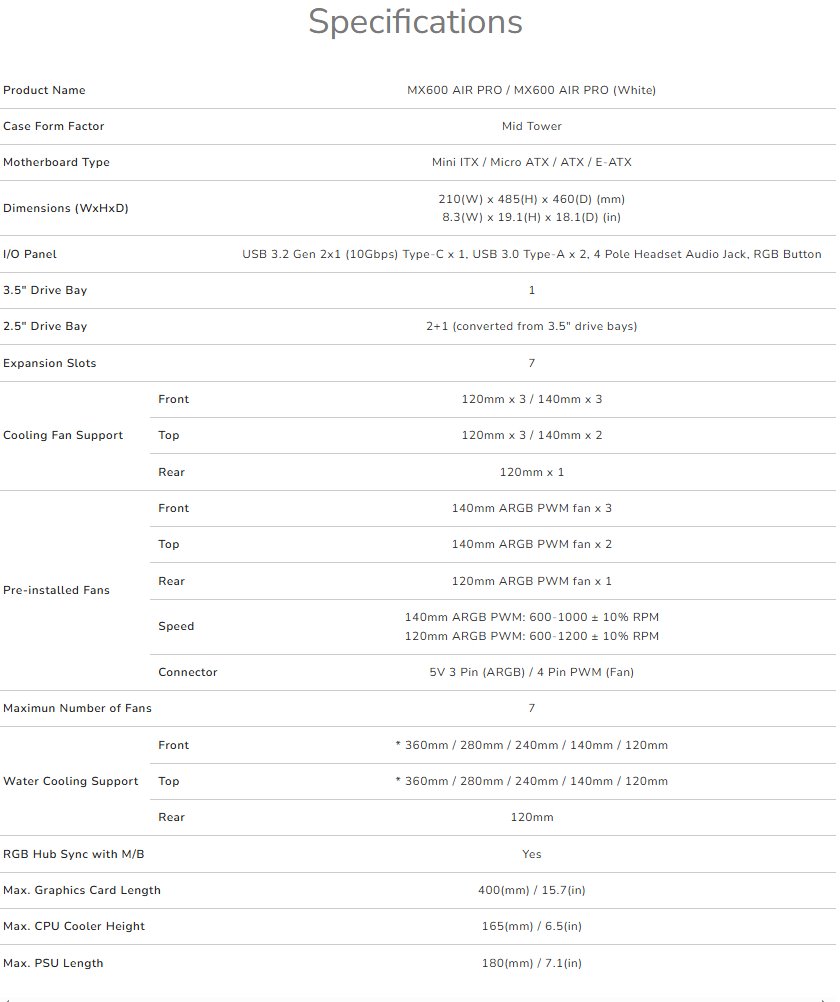 MX600 Air Pro zároveň podporuje vodní chlazení s radiátory až do velikosti 360 mm, které lze instalovat do přední nebo horní části skříně.
