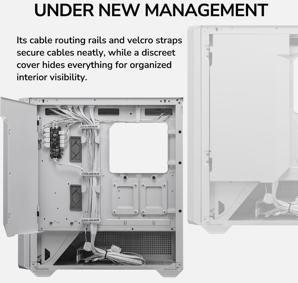 The premium cable management design features cable routing rails and seven Velcro straps for securing unruly cables. A discreet cover keeps everything out of sight for hassle-free organization and provides an immaculate view of the interior.