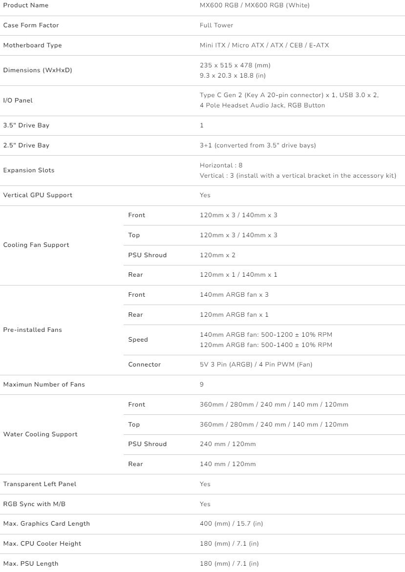 The MX600 RGB supports dual top and front 360mm water cooling options.