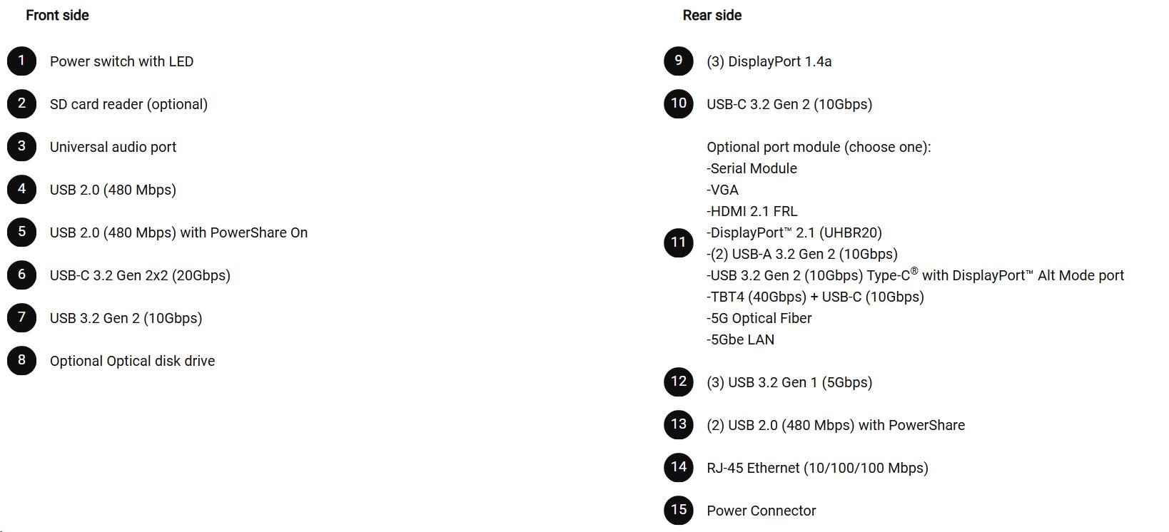 Dell Pro Max Slim FCS1250 nabízí bohatou výbavu včetně portů USB-A a USB-C, HDMI, DisplayPort a RJ-45 Ethernetu pro stabilní síťové připojení. Součástí balení je klávesnice Dell KB216 a optická myš Dell MS116 pro okamžité použití. Desktop je vybaven také technologiemi vPro pro snadnou správu a zabezpečení v podnikových sítích.