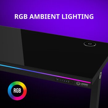 LORGAR stůl s nastavitelnou výškou, bezdrátovou nabíječkou, RGB osvětlením a USB porty, tvrzené sklo, černý