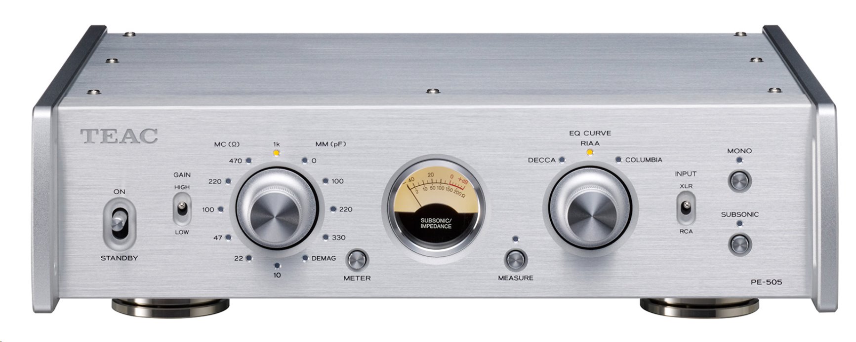 TEAC PE 505 je high end phono předzesilovač navržený pro maximálně věrnou reprodukci vinylových desek. Je postaven na dual mono architektuře, má plně vyvážené (balanced) vstupy i výstupy, podporuje balanced MC připojení a využívá vysoce přesné RIAA / DECCA / COLUMBIA ekvalizační křivky. Díky extrémní přesnosti, univerzálním možnostem nastavení a propracované konstrukci náleží mezi nejlepší phono předzesilovače své kategorie.