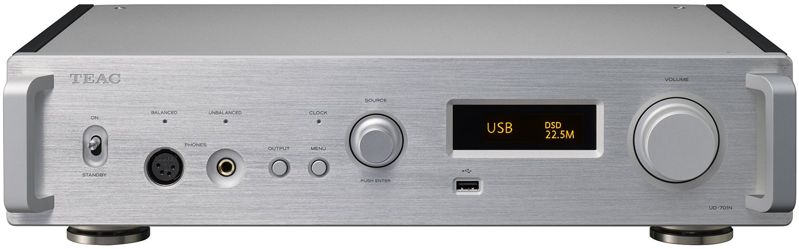 TEAC UD 701N je top model řady Reference 700 - kombinuje USB DAC, síťový streamer, analogový předzesilovač i výkonný sluchátkový zesilovač v kompaktním celokovovém šasi. V jádru najdeme nově navržený TEAC ?? diskrétní DAC, který zvládá 384?kHz PCM a DSD až do 22,5?MHz, a díky dual mono topologii s oddělenými transformátory pro L/R kanál přináší výjimečnou hloubku, čistotu a stereo separaci.